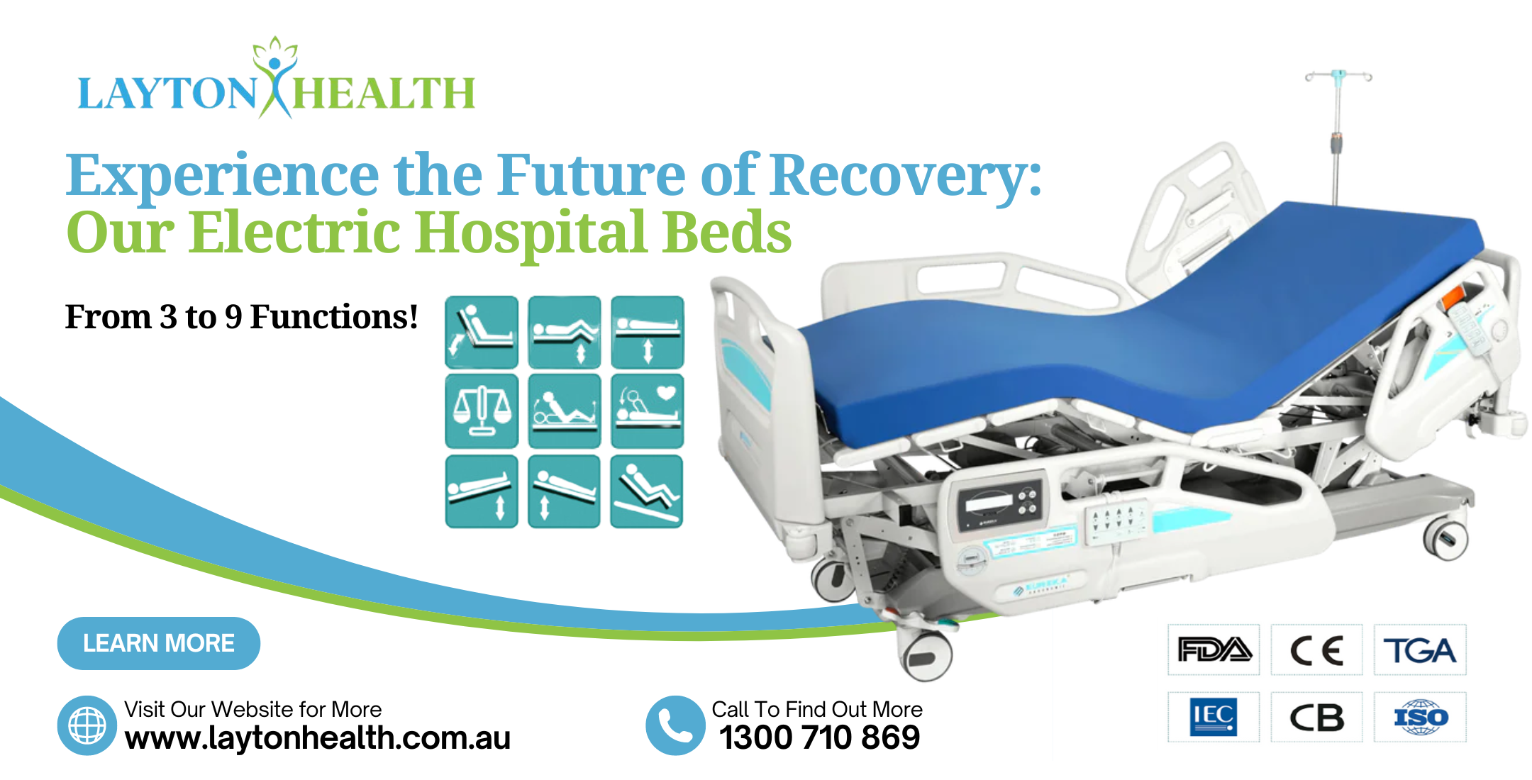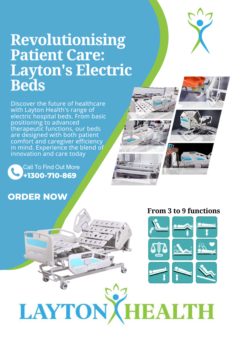 Explore Layton Health's cutting-edge Electric Beds, designed to revolutionise patient care and comfort in healthcare settings. Our comprehensive range of electric beds, available in 3-function, 5-function, 7-function, and 9-function variants, offers unparalleled versatility and innovation. Crafted with meticulous attention to detail, each bed features electronically controlled functions such as height adjustment, knee lift, tilt control, and more. From hospitals to home care, our electric beds provide ergonomic solutions that prioritise patient well-being and caregiver efficiency. Discover the perfect blend of technology, sustainability, and design with Layton Health's Electric Beds. Request a quote today and elevate your care standards with our trusted and TGA-registered medical equipment
